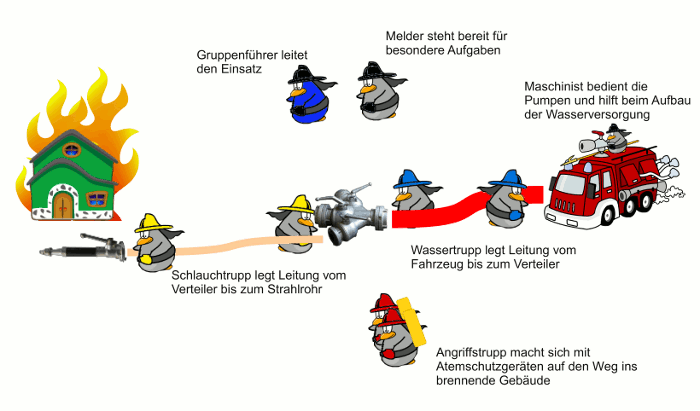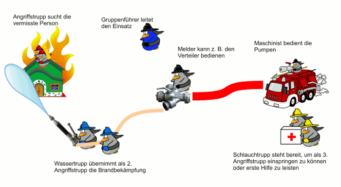 Der Maschinist ist für alle größeren Maschinen zuständig: Er fährt das Fahrzeug, bedient die Pumpen (die bei dieser Trockenübung nicht zum Einsatz kamen), ist aber auch für das Sichern der Einsatzstelle mit Warnblinkanlage und Blaulicht verantwortlich und hilft beim Aufbau der Wasserversorgung. Der Melder übermittelt Nachrichten und übernimmt auf Anordnung des Gruppenführers besondere Aufgaben. Der Wassertrupp stellt die Wasserversorgung von der Wasserquelle (in diesem Fall also vom Fahrzeugtank) bis zum Verteiler her. Ist der Wassertrupp mit seiner Arbeit fertig, kann er als zweiter Angriffstrupp eingesetzt werden. Der Schlauchtrupp stellt die Wasserversorgung vom Verteiler bis zum Angriffstrupp (also bis zum Strahlrohr) her und kann bei Bedarf als dritter Angriffstrupp eingesetzt werden – was hier aber nicht nötig war. Dabei arbeiten Wassertrupp und Schlauchtrupp gleichzeitig – sodass die Leitungen zum und vom Verteiler auch gleichzeitig fertig sind. Der Angriffstrupp schließlich ist im Allgemeinen derjenige, der mit dem Strahlrohr in der Hand das Feuer „angreift“.