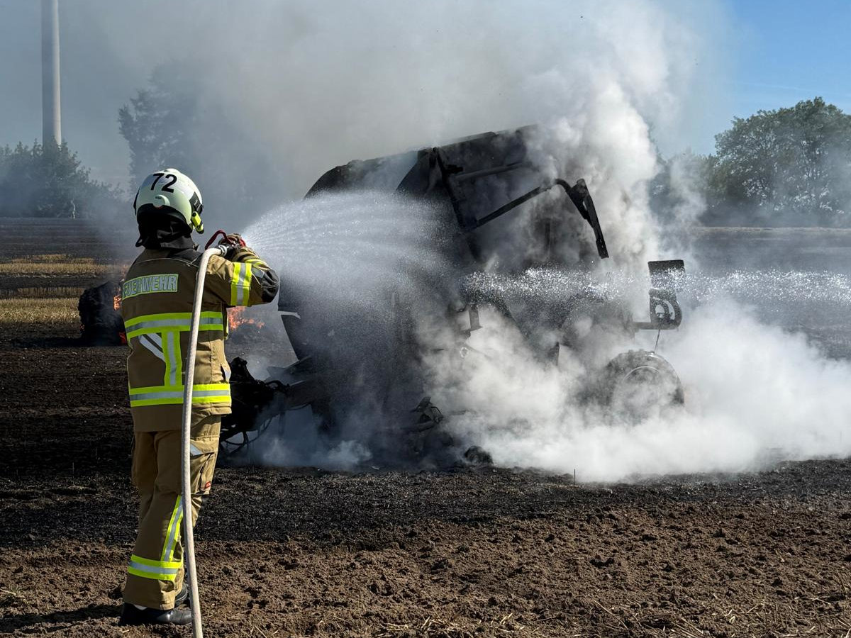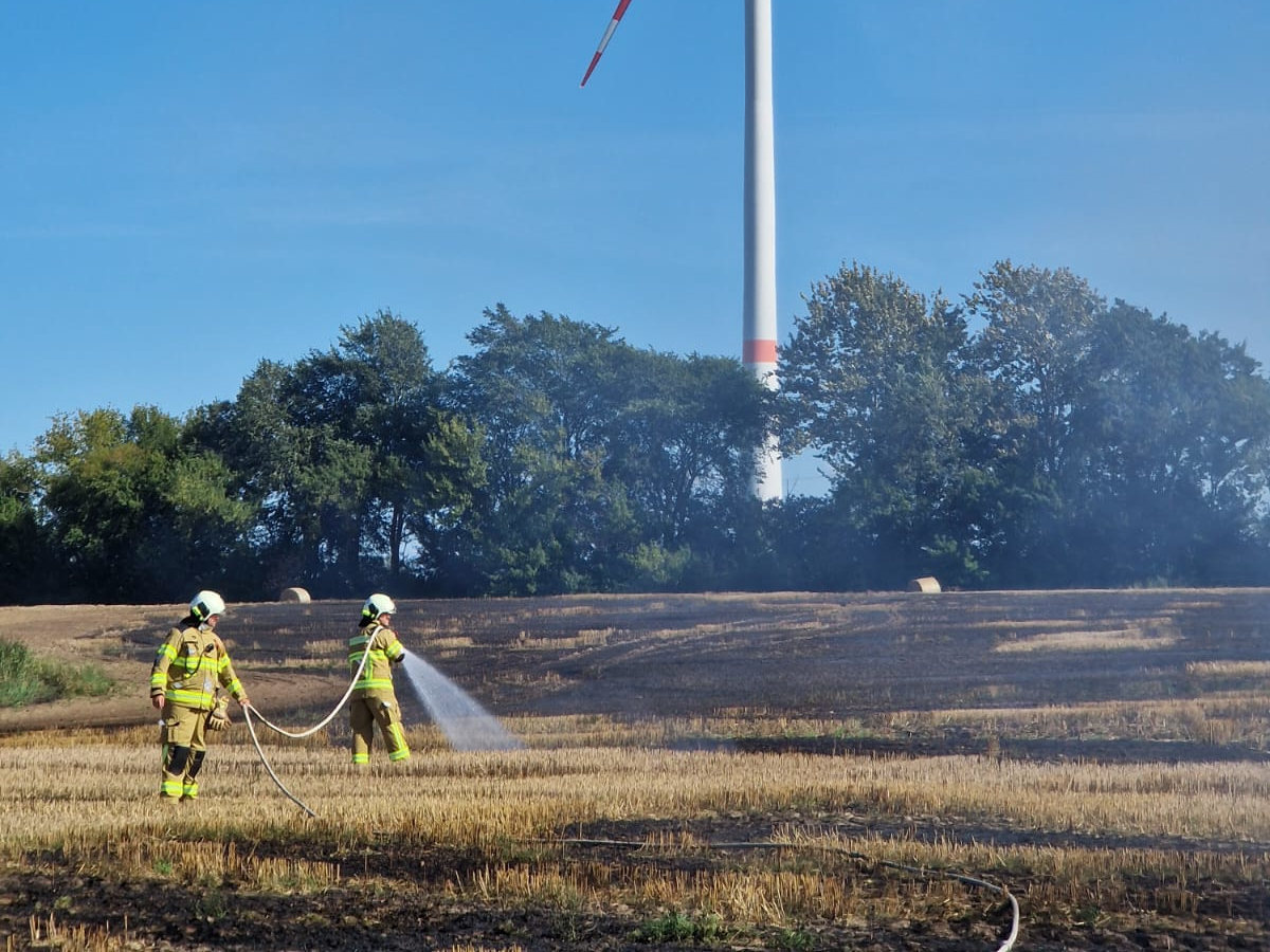 Starke Rauchentwicklung, mehrere Feuerwehren bereits vor Ort sowie 2 Traktoren mit Pflug, Brandbekämpfung Feld und Strohpresse, Beseitigung Glutnester, Unterstützung FF Poppendorf beim Schaumeinsatz an der Strohpresse.