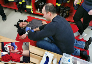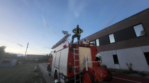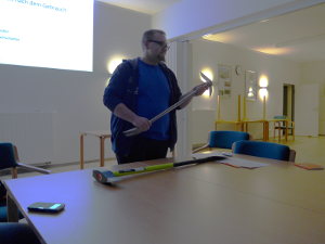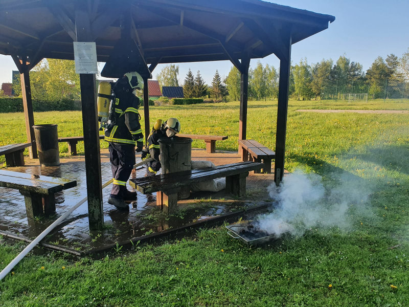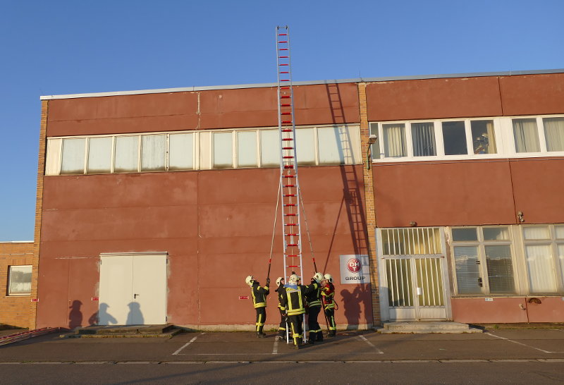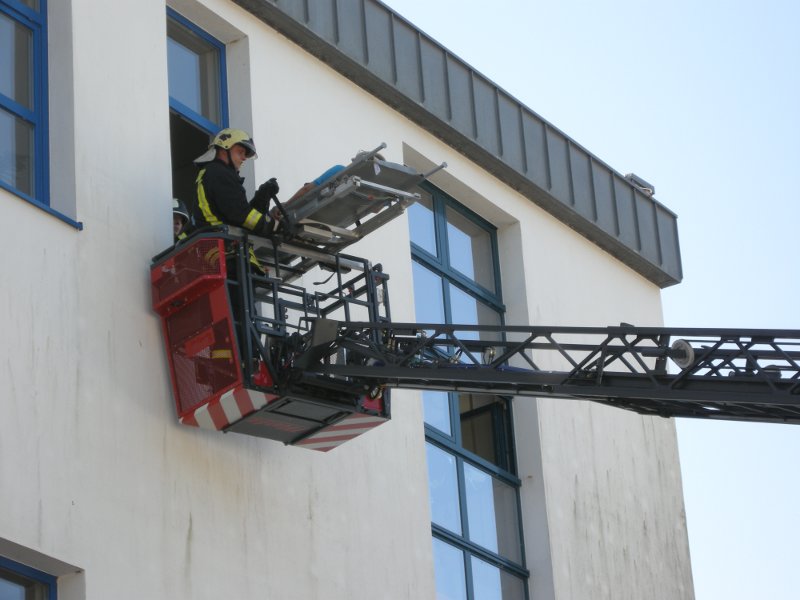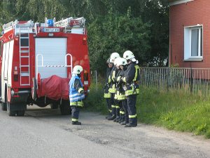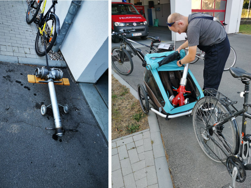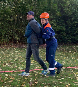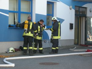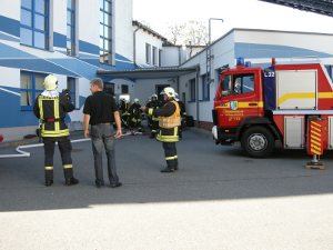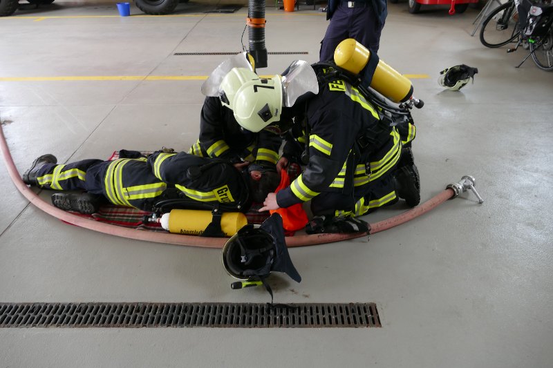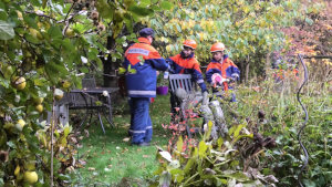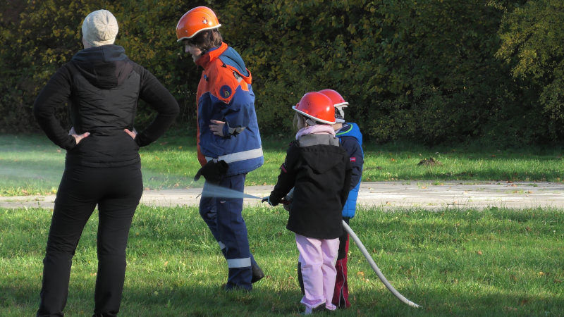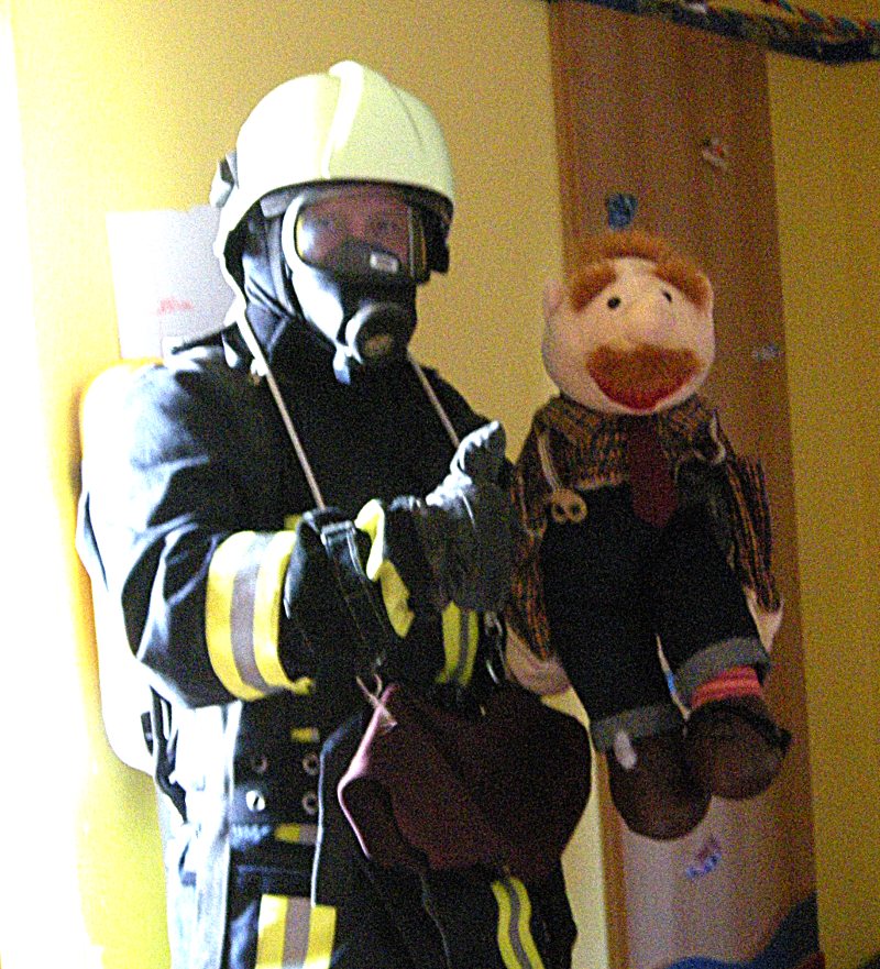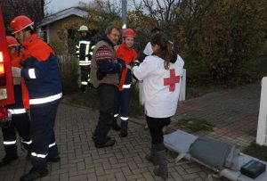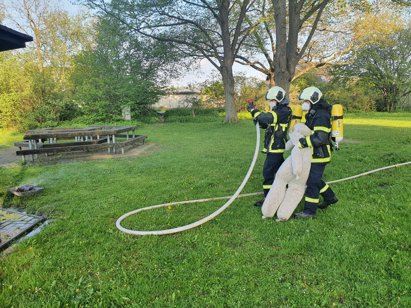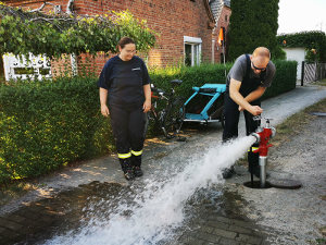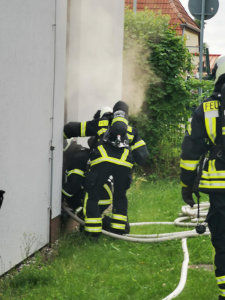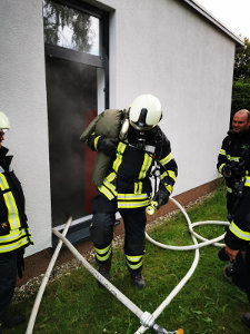 Bis zum Eintreffen an der Kita mussten die neun einsatzbereiten Kameradinnen und Kameraden noch von einem echten Einsatz ausgehen, erst vor Ort erfuhren sie, dass es sich um eine Übung handelte. Aber ob Übung oder „in echt“ – der Ablauf ist der gleiche: Zunächst brachte die Einsatzleiterin Sabrina Markart in Erfahrung, was genau passiert war; Schläuche mussten verlegt werden, der „Küchenbrand“ gelöscht werden und die Feuerwehrleute Sybille Markart und Bernhard Kaatz machten sich mit Atemschutzgeräten in dem „verrauchten“ Gebäude auf die Suche nach dem vermissten Opa Willi, ständig über Funk in Verbindung mit der Einsatzleitung. Opa Willi wurde schließlich in „leicht panischem, aber ansprechbaren“ Zustand aufgefunden und schnellstmöglich in Sicherheit gebracht. (Opa Willi legt Wert auf die Feststellung, dass der Eindruck der Panik natürlich nur durch sein schauspielerisches Talent entstand, und denkt über einen Berufswechsel nach – Stuntman oder Feuerwehrmann.)