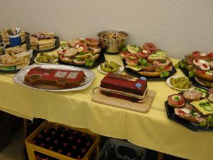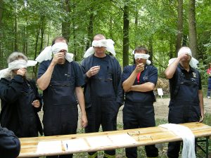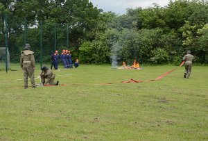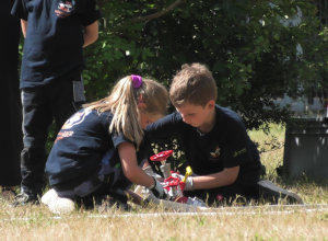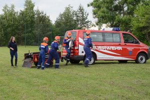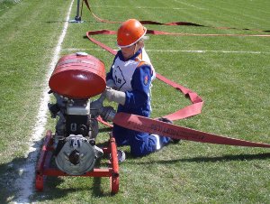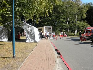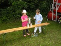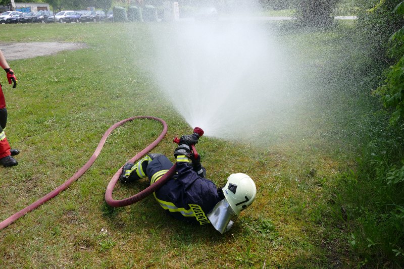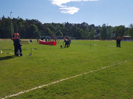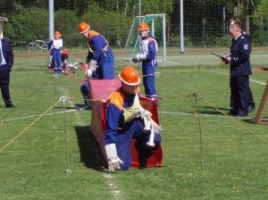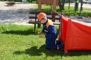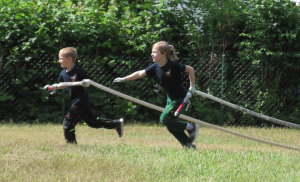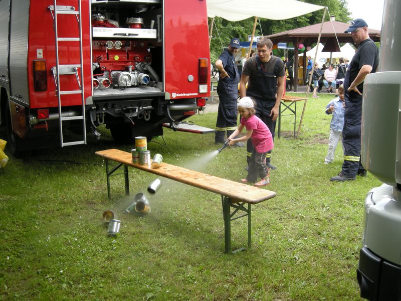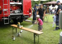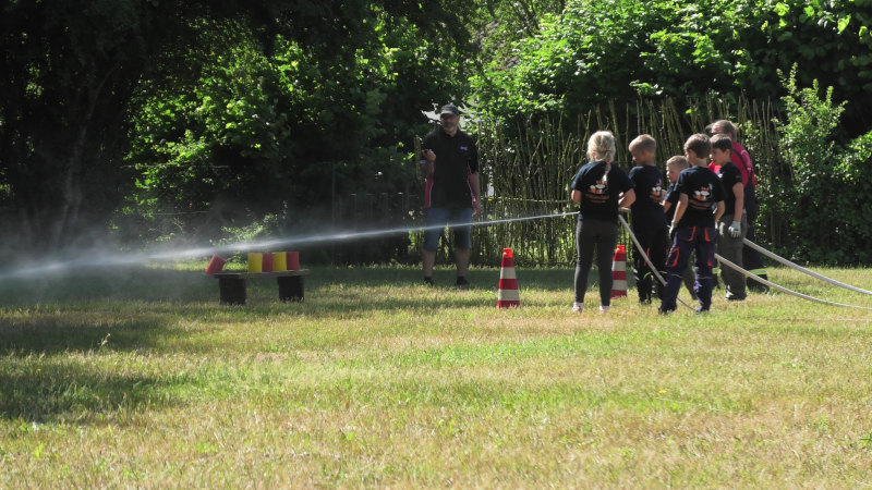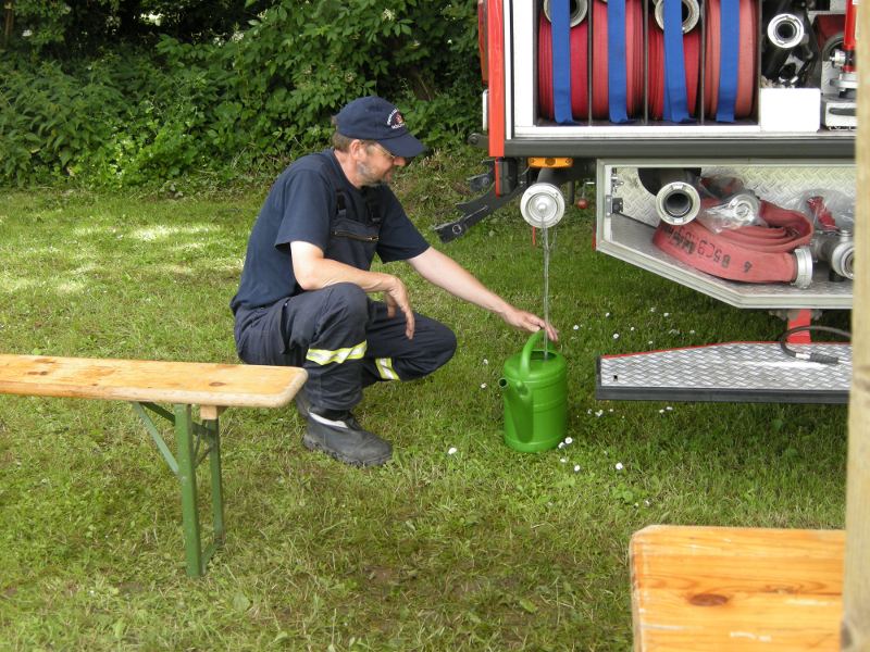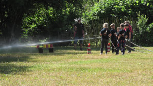 Es waren 16 Spielstationen vorbereitet, unter anderem: Feuerwehreinsatzsachen anziehen; Schlauch auf Zeit rollen; Pedalo fahren; Stiefelweitwurf; eine Leitung aus Regenrinnenteilen zu bauen, um darin Wasser zu fördern; bis hin zum Ertasten von Feuerwehrgeräten und einem Wissenstest!