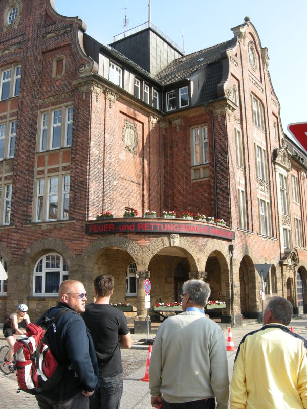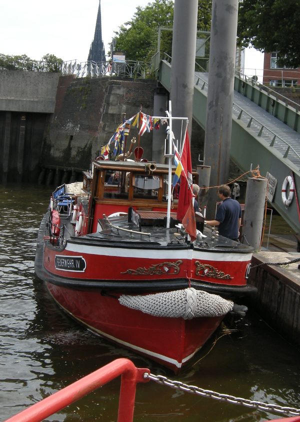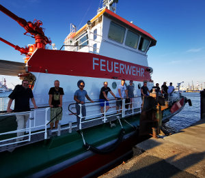 Im Juni 2010 hatte die FFw Mönchhagen auf dem Flugplatz Purkshof zum Thema „Brandschutz“ informiert. Zum Dank dafür wurde sie nun eingeladen, das Feuerlöschboot der Feuerwache 11 – Innenstadt in Hamburg zu besichtigen. Früh um 6 ging es los – der Gastgeber Lars Seemann von der BF Hamburg holte uns am Rande von Hamburg ab, um uns durch das Verkehrschaos zu lotsen – denn in Hamburg war Triathlon-Wochenende. Im 100 Jahre alten Gebäude der Feuerwache gab es erst einmal ein kräftiges Frühstück, dann zeigte Lars uns zunächst die Fahrzeuge. Auf dem Weg in die Fahrzeughalle bekamen wir auch die Rutschstange zu Gesicht – diese wird aber heute nicht mehr benutzt, das Verletzungsrisiko ist zu hoch. Anschließend ging es zur Hauptattraktion unseres Ausflugs – dem Löschboot. Vielmehr, den Löschbooten. Neben dem modernen Boot lag das historische Feuerlöschboot „Feuerwehr IV“, das von 1930 bis 1980 Dienst tat. Es ist voll betriebsfähig und das älteste noch fahrende Feuerlöschboot in Deutschland. Wir gingen dann aber an Bord des heute Dienst tuenden Feuerlöschbootes. Auf diesem ging es los zur Hafenrundfahrt, auf der wir viel Interessantes zum Hafen und über das Boot erfuhren.