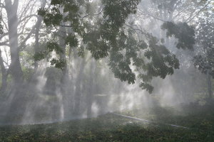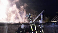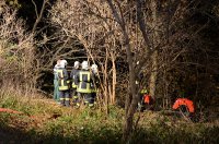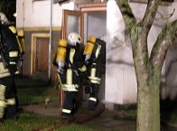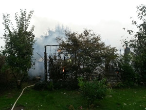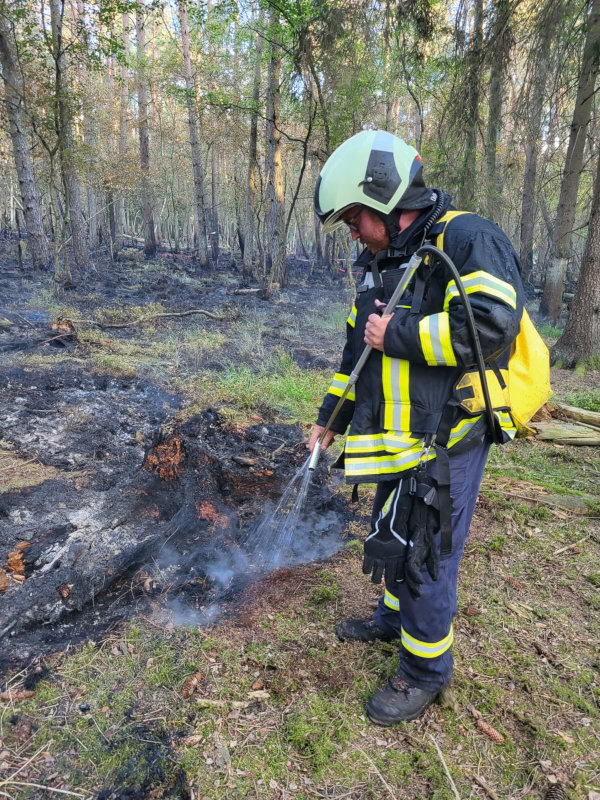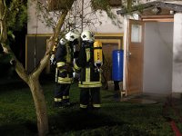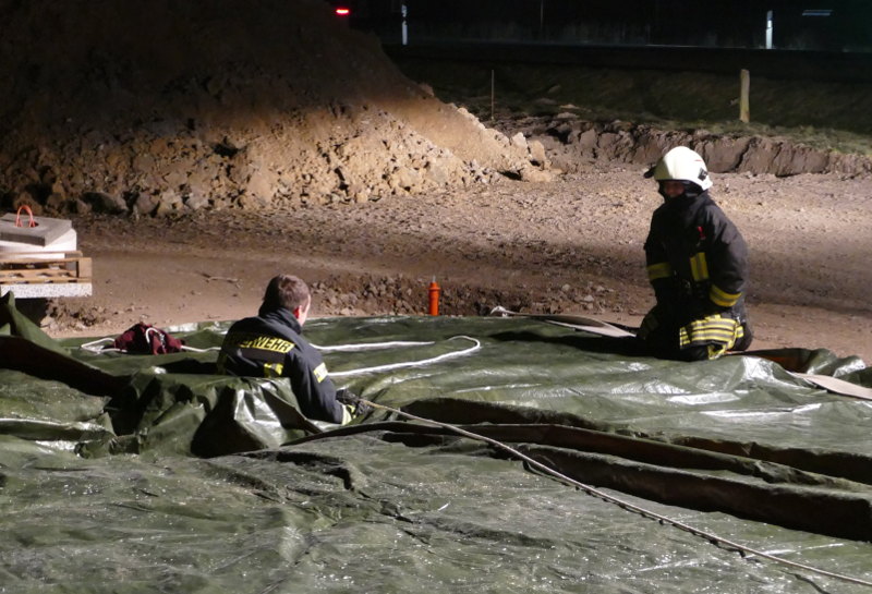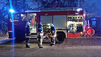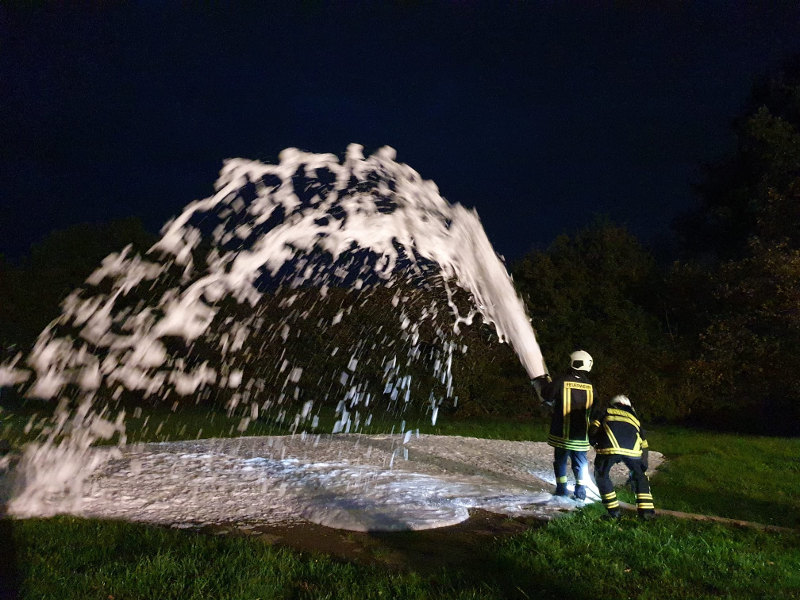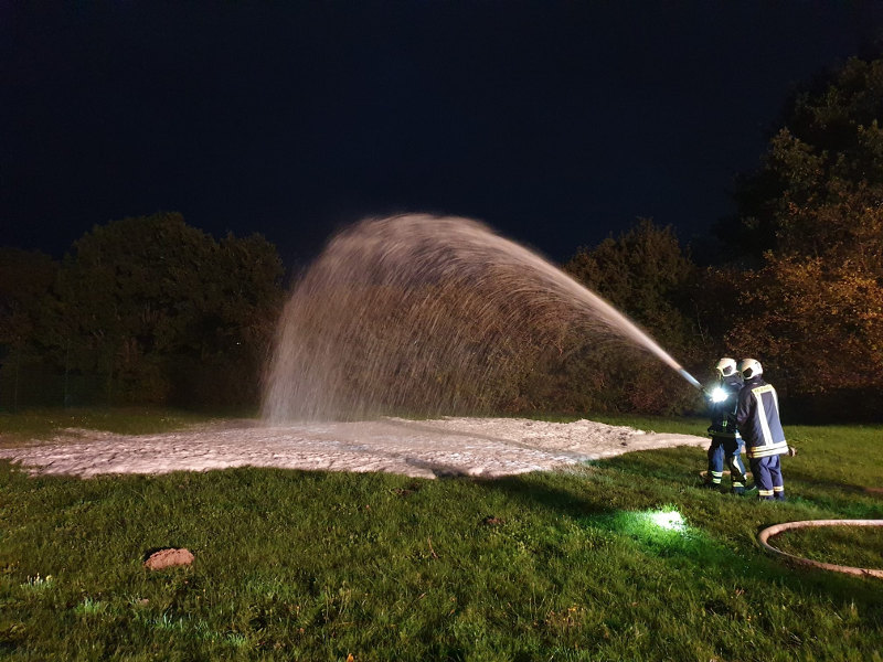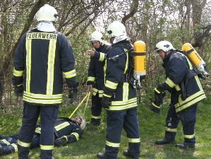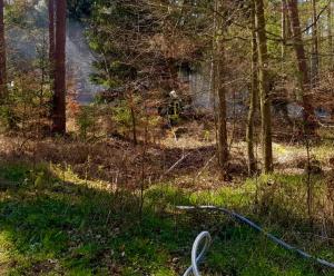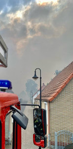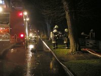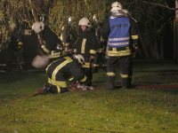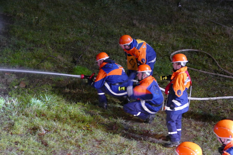 Eine Holzmiete von mehreren Metern Länge war in einem Garten in Brand geraten. Zunächst erfolgte die Brandbekämpfung unter Atemschutz mittels C-Rohr, dann wurde ein weiteres C-Rohr zu Hilfe genommen. Um auch tiefere Schichten erreichen zu können, wurde die Holzmiete auseinandergerissen und ausgebreitet. Die letzten Glutnester wurden mithilfe von Netzmittel gelöscht.