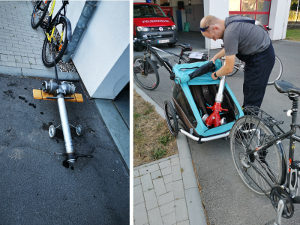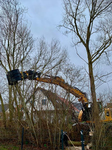 Ein Baugerüst mit einer großformatigen Werbeplane war durch Sturm aus der Verankerung an der Gebäudemauer gerissen worden und stand um ca 45 Grad geneigt über den Fuß- und Radweg, ein vollständiges Umfallen wurde noch durch einen Zaun und das Wartehäuschen einer Bushaltestelle verhindert.