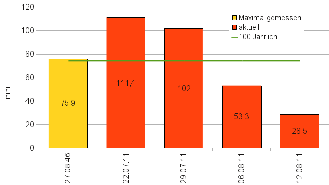 Eine statistische Analyse der Niederschläge vom 22.7.2011 und vom 29.7.2011 ergibt, dass ein Tagesniederschlag in dieser Größenordnung nur einmal in 1000 Jahren