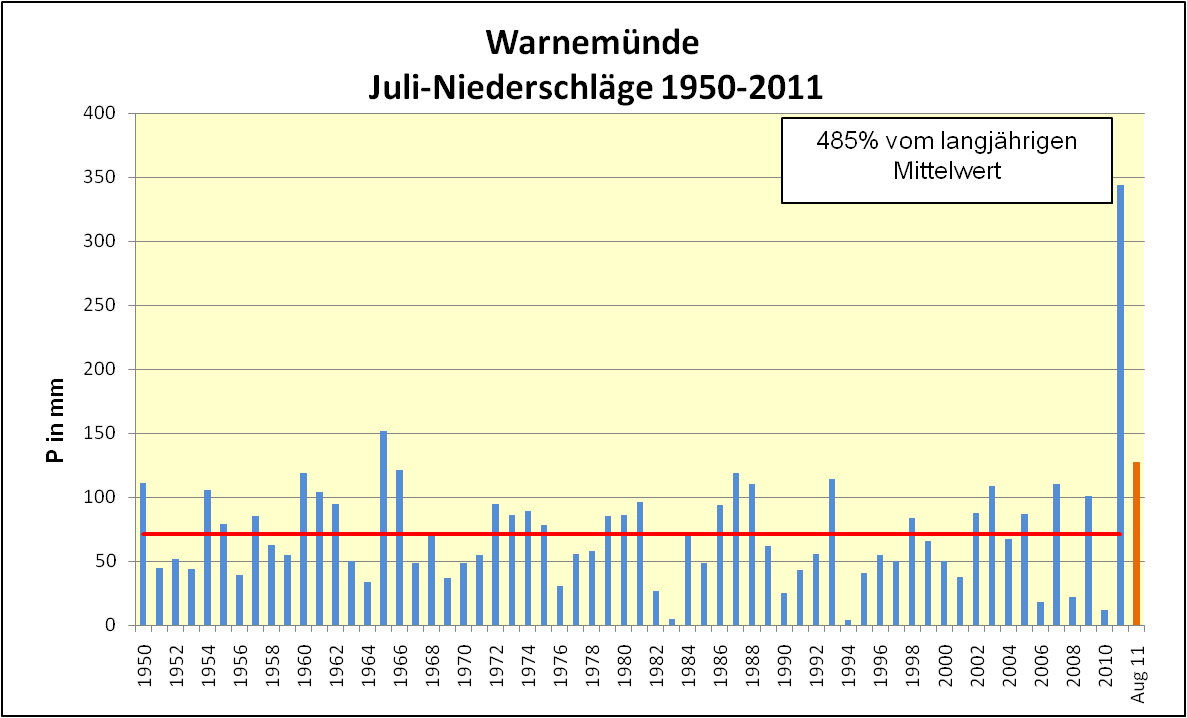 Der höchste in Warnemünde jemals gemessene Monatsniederschlag stammt vom August 1946 und betrug 188 mm. Der aktuelle Wert für den Juli 2011 betrug 343,9 mm.