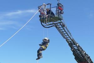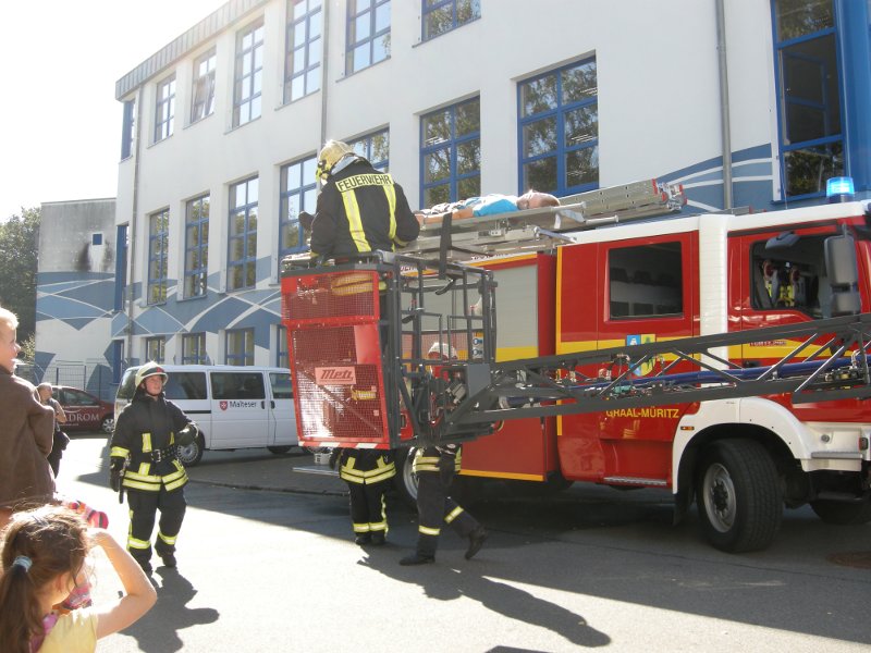 Der 1. September war für „Opa Willi“ (rechts im Bild) ein aufregender Tag – musste er sich doch von der Mönchhäger Feuerwehr retten lassen. Als Bewohner der Kindertagesstätte Mönchhagen ist Opa Willi Trubel gewöhnt – aber die Rolle einer Person zu spielen, die in einem brennenden Gebäude vermisst wird, das war doch mal etwas ganz Neues.