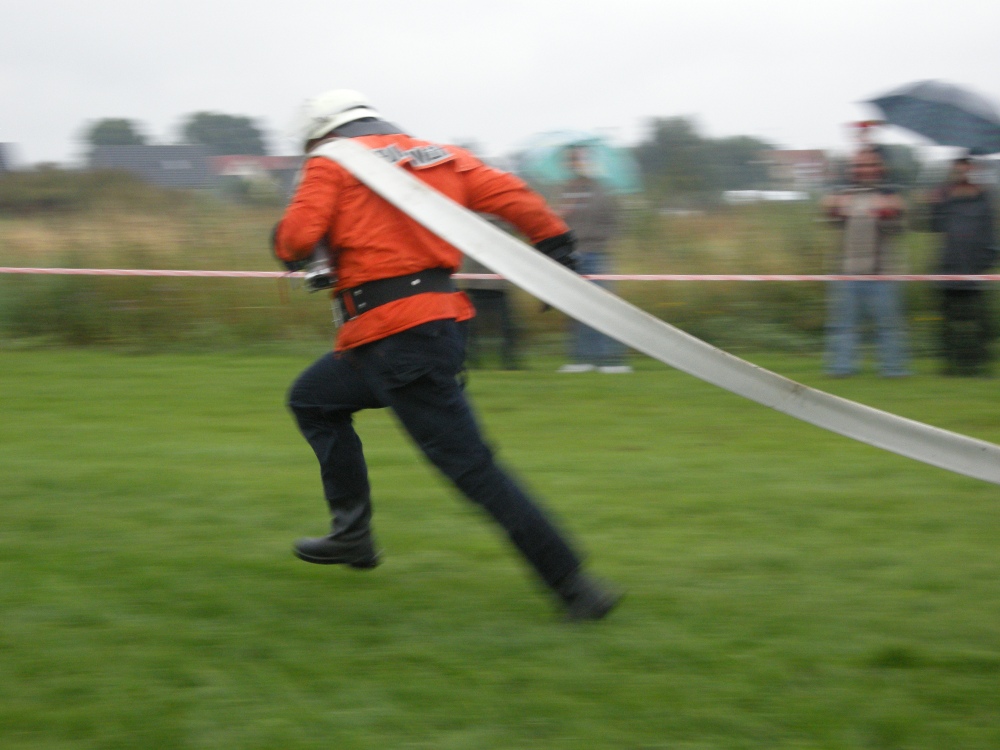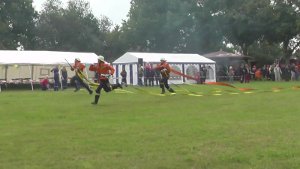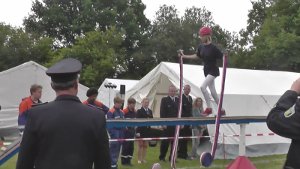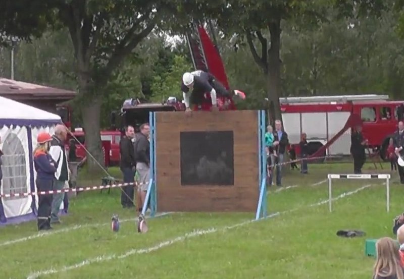 Aber um Mönchhäger Feuerwehrleute zu entmutigen, braucht es etwas mehr als einen kaputten Verteiler – für den zweiten Durchgang liehen sie sich einen Verteiler bei den Bentwischer Kameraden und „kauften“ (wie im Profi-Sport so üblich) auch für einen verletzten Kameraden einen Ersatzspieler aus Bentwisch ein. Als die Zeit von 38,36 Sekunden verkündet wurde, hellten sich die Mienen wieder auf – denn die bedeutete den 2. Platz! Allerdings recht knapp – nur 0,39 Sekunden trennten die Mönchhäger vom Drittplatzierten Bentwisch mit 38,75 Sekunden.
