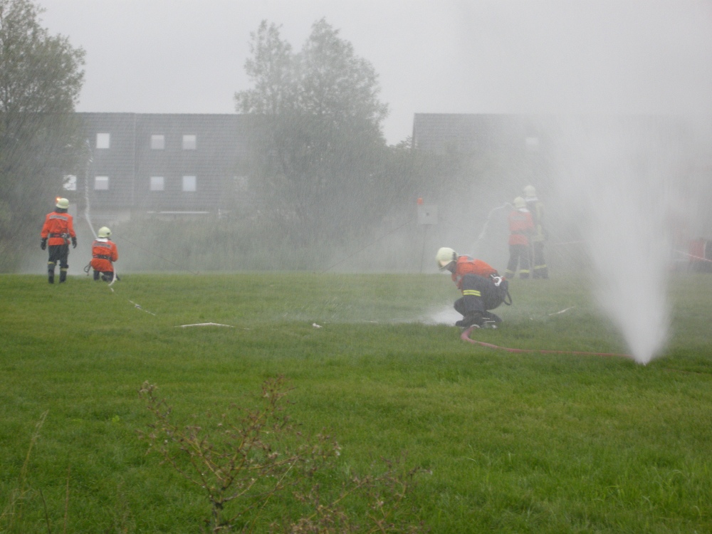 Gut bewährt hat sich auch die Vorgehensweiste der FF Mönchhagen, ein Strahlrohr direkt an einen Pumpenausgang am Fahrzeug zu kuppeln, dann bei ständiger Wasserabgabe langsam am Feuer entlang zu fahren.