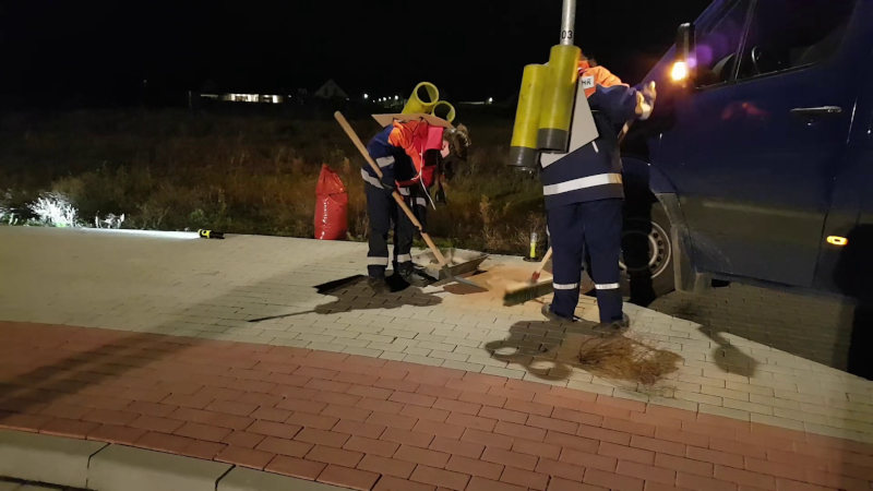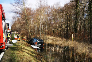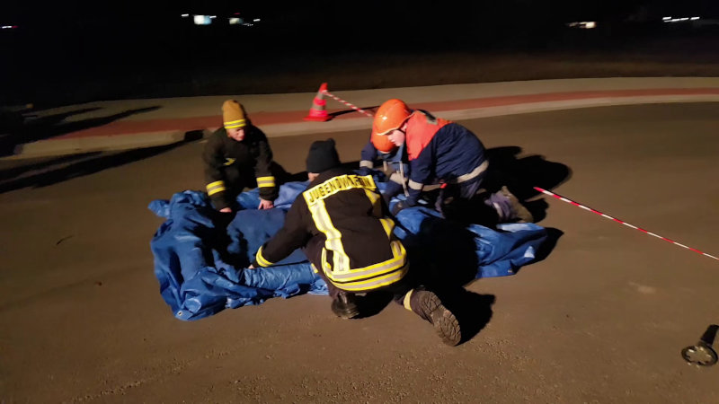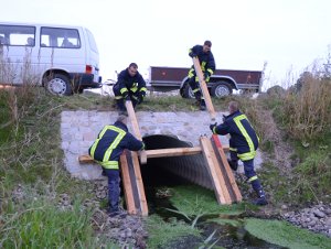 Rettungsbrett verbunden und als Brücke über Graben benutzt. Die Leitplanken an der B105 wurden mit Decken