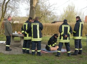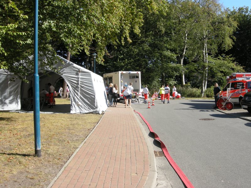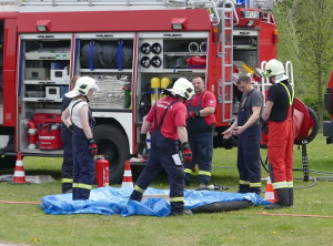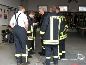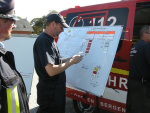 Um den Einsatzleiter bei einem Einsatz mit der großen Zahl von 11 Fahrzeugen und 58 Feuerwehrleuten aus 6 Orten zu entlasten, kam die Führungsgruppe zum Einsatz. Die Führungsgruppe muss u. a. die Lage aufbereiten, taktische Varianten ausarbeiten und den Überblick behalten, welche Wehr mit welcher Ausrüstung und welcher Besatzungsstärke angerückt ist. Dazu melden sich alle eintreffenden Gruppen zunächst bei der Führungsgruppe, die in einem technisch entsprechend ausgerüsteten Einsatzleitwagen sitzt, und warten dann dort auf ihren Einsatz. Stellt der Einsatzleiter beispielsweise fest, dass er mehr Löschwasser braucht oder weitere Atemschutzgeräteträger, muss die Führungsgruppe ihm diese schicken. Die Arbeit der Führungsgruppe zu trainieren, war ein ganz wichtiger Aspekt der Einsatzübung, wie der Amtswehrführer vom Amt Rostocker Heide, Wolfgang Krotz, erläutert. Aber es ging auch darum, das Zusammenwirken der verschiedenen Wehren zu üben, ergänzt Rudolf Kreuzmann, Einsatzleiter und Wehrführer in Graal-Müritz. Beide zeigten sich sehr zufrieden mit dem Ablauf der Übung.