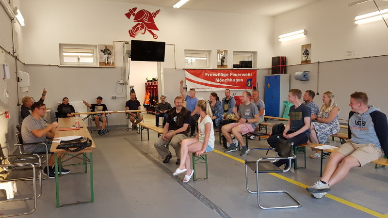 Ein Brand in der Kindertagesstätte gehört sicher zu den schlimmsten in Mönchhagen denkbaren Szenarien. Die Leiterin der Kita Frau Meyer und die Freiwillige Feuerwehr waren sich daher sofort darüber einig, den Ernstfall einmal in einer Einsatzübung durchzuspielen – natürlich abends, wenn die Kinder die Kita verlassen haben. Dabei sollten nicht nur die KameradInnen der Feuerwehr üben, sondern auch die MitarbeiterInnen der Kita das richtige Verhalten im Ernstfall trainieren. Der stellvertretende Wehrführer Thomas Salzmann demonstrierte kurz vorher anhand eines Videos, wie ein solcher Ernstfall ablaufen könnte und informierte über das richtige Verhalten. Um 18.35 Uhr wurde es dann Ernst – Frau Polsfuss setzte den Notruf ab an die (natürlich vorher über die Übung informierte) Leitstelle und gleich darauf ging auf den Piepern der Feuerwehrleute die Meldung „Küchenbrand in der Kindergarteneinrichtung Mönchhagen; vermisste Person“ ein.