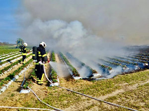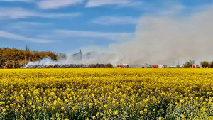 Starke Rauchentwicklung, mehrere Feuerwehren bereits vor Ort sowie 2 Traktoren mit Pflug, Brandbekämpfung Feld und Strohpresse, Beseitigung Glutnester, Unterstützung FF Poppendorf beim Schaumeinsatz an der Strohpresse.