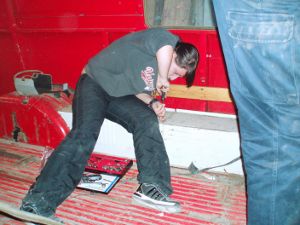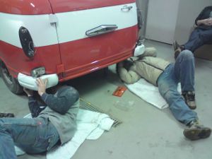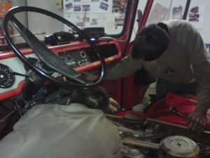 „Oh je, oh je, das wird ein ganzes Stück Arbeit!“, dachten wir viele Male. Doch mit jeder weiteren Stunde, die wir damit verbrachten, ihn wieder aufzubauen, wuchs auch unser Ehrgeiz. Zuerst mussten wir den Barkas in alle Einzelteile zerlegen, dies geschah in der ehemaligen Kartoffelsortierhalle bei der Gerüstbaufirma von Herrn von Renteln. Wir stellten schnell fest, dass einige Teile neu besorgt werden mussten. Das war gar nicht so einfach, wie wir uns das vorgestellt hatten. Nachdem wir viele Oldtimermärkte und Messen besucht hatten, hatten wir dann endlich doch alle notwendigsten Teile zusammen. Im März 2009 konnte unser Schmuckstück dann zum Sandstrahlen nach Rostock-Gehlsdorf. In der Firma von Herrn Thiele wurde dort innerhalb einer Woche der Unterboden gestrahlt. Die Schweißarbeiten und das Ausbeulen begannen wir im Mai 2009. Dank der fachlichen Unterstützung von Herrn Kuhl, der auch seine Werkstatt bereitstellte, ging es um einiges schneller, sodass wir im September 2009 die Blecharbeiten abschließen konnten. Mitte September 2009 wurde der Unterboden des Barkas konserviert, dafür fanden wir Platz in Hugos Scheune. Anfang Dezember 2009 war es soweit, unser Rohdiamant konnte endlich zum Lackieren, da uns die Firma AB-Lack nach vielen verschiedenen Kostenvoranschlägen das bezahlbarste Angebot gemacht hat. Am 21.01.2010 bekamen wir den B 1000 zurück. Wir konnten unseren Augen kaum trauen, nun strahlte er in neuem Glanz in unserer Wagenhalle. Im Jahr 2010 hatten wir noch viel Arbeit vor uns, aber die erste Fahrt mit dem neuen alten Barkas B 1000 durch Mönchhagen konnte schon stattfinden!