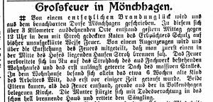 In mönchhagen ist gestern der zu hufe nr 15 gehörige, mit stroh gedeckte tagelöhnerkaten nebst stall abgebrannt und sind beim retten von sachen die im katen wohnhaft gewesene tagelöhnerfrau witt sowie schmied leverenz und tagelöhner möller und schwerin im brennenden hause umgekommen, ausserdem tagelöhner jess an kopf und händen stark verbrannt.