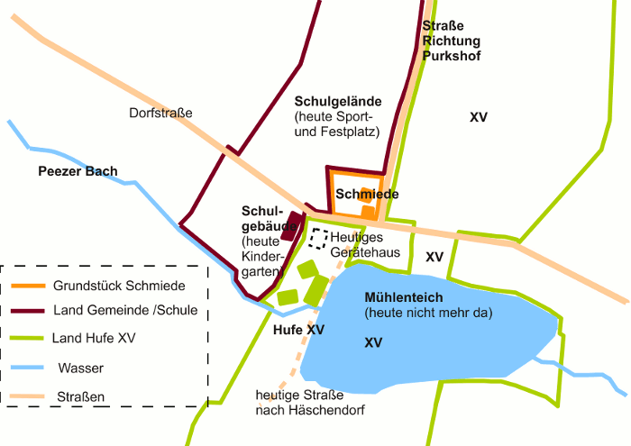 Die betroffene Hufe 15 lag übrigens etwa dort, wo heute das Feuerwehrgerätehaus steht, das ersehen wir aus einer alten Karte von der Dorffeldmark Mönchhagen, D. A. [Domanialamt] Teutenwinkel von 1894. Gegenüber liegen heute noch alte Schmiedegebäude. Das Schulhaus lag ebenfalls direkt nebenan, in westlicher Richtung. Schmied und Lehrer waren also direkte Nachbarn. Der Hof Nr. 15 war auch als Mittelhof bekannt, da der Erbpächter Schulze drei Höfe besessen hat.