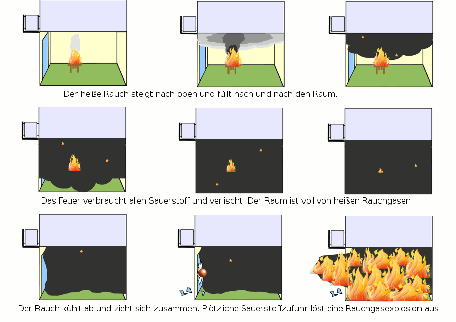 Onkel Otto hat schon wieder vergessen, die Kerze auf dem Stubentisch auszublasen, bevor er mit seinem Mops zum Spaziergang aufgebrochen ist. Die Kerze steht dummerweise wieder auf einem Holzteller und als Onkel Otto gerade den Stadtwald erreicht, stehen Holzteller, Kunstfasertischdecke, Plastikblumen und Tisch in Flammen. Holz und Kunststoffe sondern Gase ab, wenn sie erhitzt werden oder brennen, sogenannte Pyrolysegase. Diese Gase bilden die Hauptbestandteile des Rauchgases, also des Rauches, und sind brennbar. Damit ein brennbares Gas auch tatsächlich brennen kann, muss Sauerstoff vorhanden sein und Sauerstoff und Gase müssen durchmischt sein, damit beide auch in Berührung kommen. Diesmal sind die Fenster geschlossen, aber Onkel Ottos Haus ist alt, es hat klapprige, undichte Fenster – von denen auch noch eins gekippt ist –, sodass Luft von außen eindringen kann. Aber natürlich nicht so sehr viel Luft, und damit auch nicht viel Sauerstoff. Sauerstoff und Rauchgase vermischen sich daher nur unzureichend und die Gase verbrennen nicht. Da Tisch, Tischdecke und Plastikblumen aber weiter brennen, entstehen mehr und mehr brennbare Gase. Diese sind heiß, was bedeutet, sie sind leichter als die Umgebungsluft, und steigen nach oben. Unter der Zimmerdecke sammeln sich nun also die überhitzten, brennbaren Gase. Es kommt lediglich an der Grenze zwischen Rauch und Luft zu kleinen Feuerzungen, dort, wo die Sauerstoffkonzentration zufällig doch hoch genug ist. Diese sogenannten „Dancing Angles“ sind ein Alarmsignal – wenn der Feuerwehrmann sie im Rauch sieht, weiß er, dass die Gefahr einer Rauchdurchzündung droht.