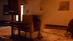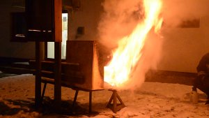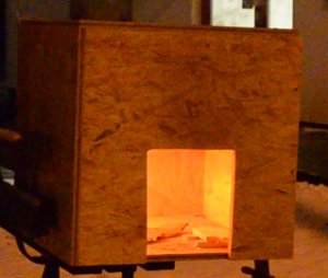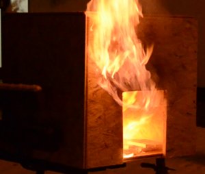 Die Maße des Hauses betrugen ca. 65 cm in Länge, Höhe und Breite; es hat eine Öffnung von ca. 30 cm Höhe und Breite. In dem Haus wurde ein Feuer entzündet, nach ca. 2,5 Minuten kam es im Haus zum Flashover. In den nächsten Versuchen wurde die Öffnung jeweils mit einem Holzdeckel verschlossen, das Feuer im Haus erlosch. Nach Entfernen des Deckels dauerte es unterschiedlich lang, aber in den meisten Fällen entzündete sich der Rauch und es kam zu einem Backdraft. Die Flammen schossen bis zu einem knappen Meter weit aus der Öffnung heraus.