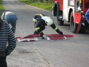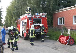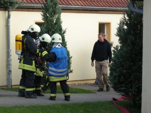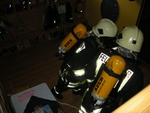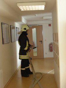 So weit die allgemeinen Aufgaben der einzelnen Mitglieder. In dieser Übung waren jedoch zwei Aufgaben zu bewältigen – der Küchenbrand musste gelöscht werden und die vermisste Person gefunden und gerettet werden, wobei die Rettung von Menschen – wenn irgendmöglich – Vorrang hat. Während Wassertrupp und Schlauchtrupp die Leitungen vom Fahrzeug zum Verteiler und vom Verteiler zum Strahlrohr verlegten, machte sich der Angriffstrupp daher mit Atemschutzgeräten auf ins Gebäude, um die vermisste Person zu suchen. Um den Rückweg im verrauchten Gebäude nicht zu verlieren, ist er mit einer Leine nach draußen gesichert. Raum für Raum wird abgesucht, dabei steht der Angriffstrupp jederzeit über Funk in Verbindung mit der Einsatzleitung. Ein Kamerad außerhalb der Gefahrenzone überwacht den Einsatz der Atemschutzgeräteträger, um sicherzustellen, dass er so rechtzeitig umkehrt, dass die Luft reicht.