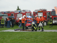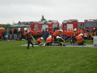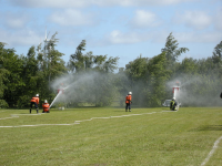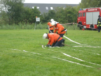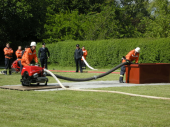 Wie beim echten Einsatz kommt es auf Schnelligkeit an – während die Saugleitung hergestellt wird, laufen bereits Schlauch- und Angriffstrupp mit den Schläuchen nach vorn und stellen die Leitungen her, damit alles bereit ist, wenn das Wasser kommt (Bild 4 und 5). Hierbei kommt es auf gute Koordination an, denn das Wasser darf nicht zu spät, aber auch nicht zu früh in die Druckschläuche fließen, wenn die Leitung noch nicht fertig zusammengekuppelt ist.