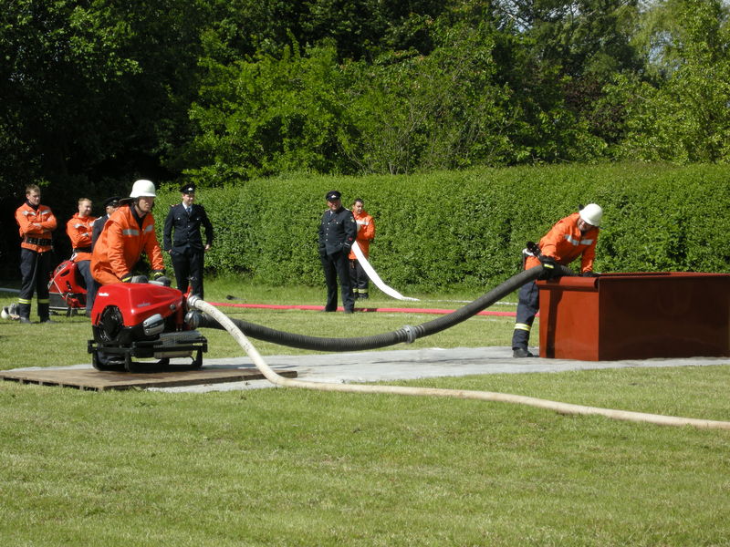 Aus den Saugschläuchen und dem Saugkorb muss eine Saugleitung zusammengebaut werden (Bild 4, Bild 7), über die die Tragkraftspritze das Wasser aus dem Vorratsbottich saugen kann. Aus den B-Schläuchen wird eine Zubringerleitung ausgehend von der Tragkraftspritze in Richtung Ziel verlegt, an diese Zubringerleitung werden mittels eines Verteilers zwei Löschleitungen angeschlossen (bild 4, 5 und 6). Die Löschleitungen bestehen aus den C-Schläuchen und den Strahlrohren. (Das Wasser wird also von der Pumpe aus dem Vorratsbehälter über die Saugschläuche herausgesaugt und in die Zubringerleitung gepumpt und verteilt sich dann auf die beiden Löschleitungen.) An der Angriffslinie befinden sich zwei Angriffstrupps zu je zwei Personen. Diese versuchen nun, möglichst schnell die geforderten 10 Liter Wasser in die Zieleinrichtung zu füllen (Bild 8).