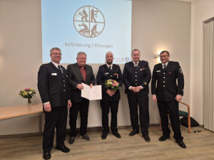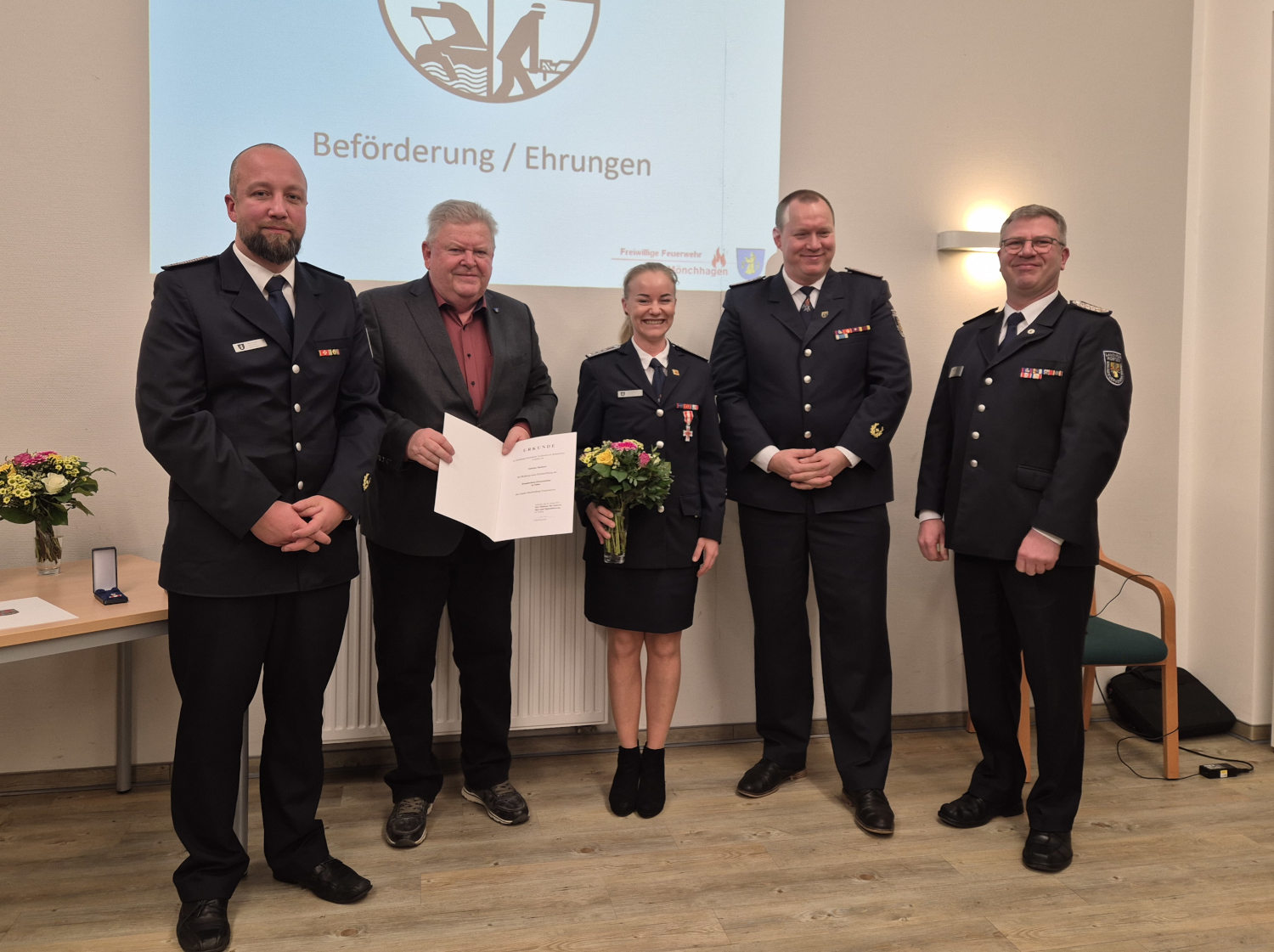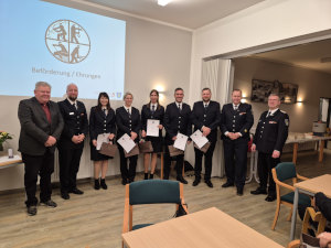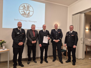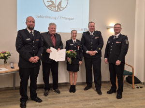 Weiter ging es mit dem Gratulieren beim Tagesordnungspunkt Ehrungen und Beförderungen. Fünf Kameradinnen und Kameraden wurden zur Feuerwehrfrau bzw. zum Feuerwehrmann befördert und ein Kamerad zum Hauptfeuerwehrmann.