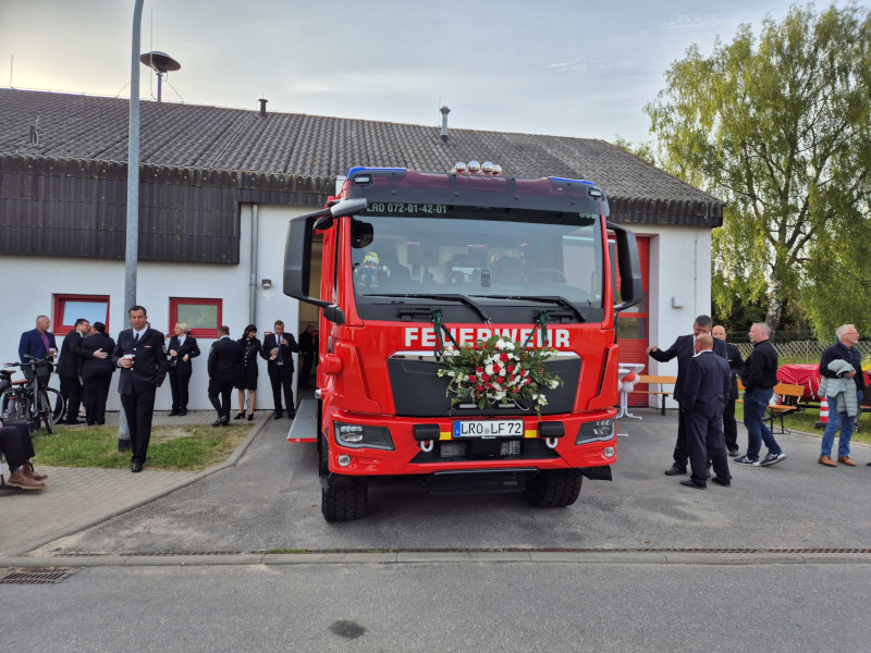Noch musste alles geheim bleiben, bis zur feierlichen Übergabe zwei Wochen später, zu der der Bürgermeister Karl-Friedrich Peters und der Wehrführer Marcel Kuhz gemeinsam eingeladen hatten. Viele Gäste hatten sich nach Mönchhagen auf den Weg gemacht, um mit der FF Mönchhagen und dem Feuerwehrverein das neue LF zu begrüßen – aus der Gemeindevertretung, der Amtsvorsteher Detlef Kröger, die Amtsleiterin des Amtes Rostocker Heide Susanne Dräger sowie die Leiterin des Ordnungsamtes Sabine Blotenberg, der Kreisbrandmeister Mayk Tessin, der Amtswehrführers Eric Fritsche, Kameraden und Kameradinnen aus den Nachbarfeuerwehren, und nicht zuletzt auch Herr Wolny von KRAFT Feuerschutz GmbH und Herr Knobloch von BFG GmbH scheuten den weiten Weg nicht.