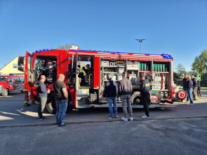 Im Anschluss an Grußworte und Glückwünsche konnten alle es kaum erwarten, das neue Mitglied der FF Mönchhagen zu bestaunen und seine Ausrüstung genau unter die Lupe zu nehmen. Womit dann der Bogen zu spannen wäre zu den o.g. Ausstattungsmerkmalen, die u. a. der Personalknappheit entgegenwirken können. Dazu gehört die Steckleiter, für die dank einer mechanischen Entnahmehilfe niemand mehr aufs Dach des Fahrzeugs klettern muss, um sie herunterzureichen. Auch die Schlauchhaspel kann von einer Person bedient werden, während früher zwei gebraucht wurden. Dasselbe gilt für die neue Haspel zur Verkehrssicherung – mit dieser kann ebenfalls eine Person allein z. B. Straßen absperren. Ergonomische Einstiegstreppen in die Mannschaftskabine erleichtern kleineren Personen das Ein- und Aussteigen. Ein zweiter Schwerpunkt bei der Ausrüstung liegt in der Wasserversorgung, die „dank“ der zunehmenden Trockenheit im Sommer immer schwieriger wird. Im neuen LF finden z. B. der selbstaufrichtende Falttank sowie das Stauwehr Platz und sind somit immer dabei. Die im Fahrzeug eingebaute Druckzumischanlage für Schaummittel erleichtert die Arbeit ungemein, weil das Schleppen der schweren Kanister mit Schaummittel der Vergangenheit angehört.