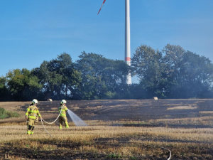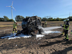Starke Rauchentwicklung, mehrere Feuerwehren bereits vor Ort sowie 2 Traktoren mit Pflug, Brandbekämpfung Feld und Strohpresse, Beseitigung Glutnester, Unterstützung FF Poppendorf beim Schaumeinsatz an der Strohpresse.
