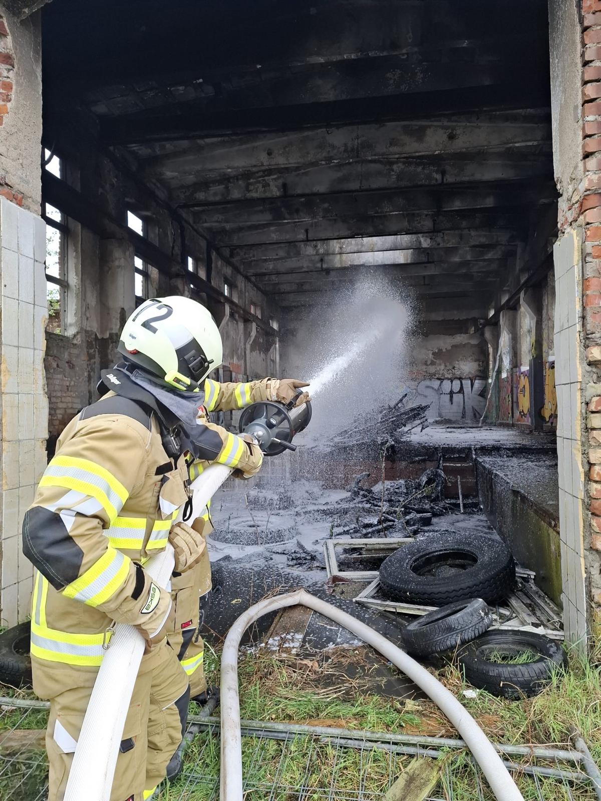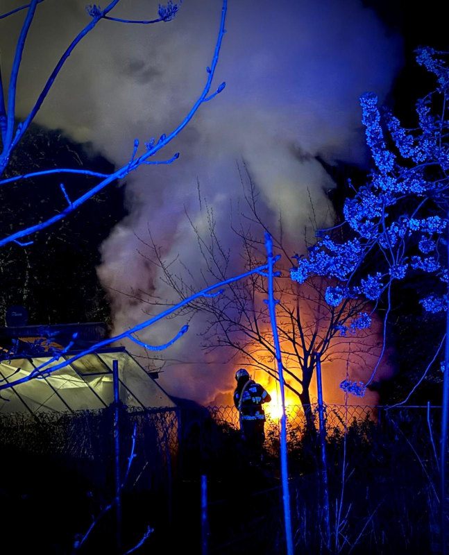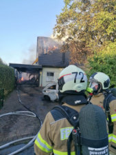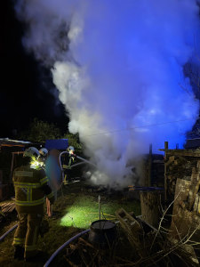 Eine Holzmiete von mehreren Metern Länge war in einem Garten in Brand geraten. Zunächst erfolgte die Brandbekämpfung unter Atemschutz mittels C-Rohr, dann wurde ein weiteres C-Rohr zu Hilfe genommen. Um auch tiefere Schichten erreichen zu können, wurde die Holzmiete auseinandergerissen und ausgebreitet. Die letzten Glutnester wurden mithilfe von Netzmittel gelöscht.