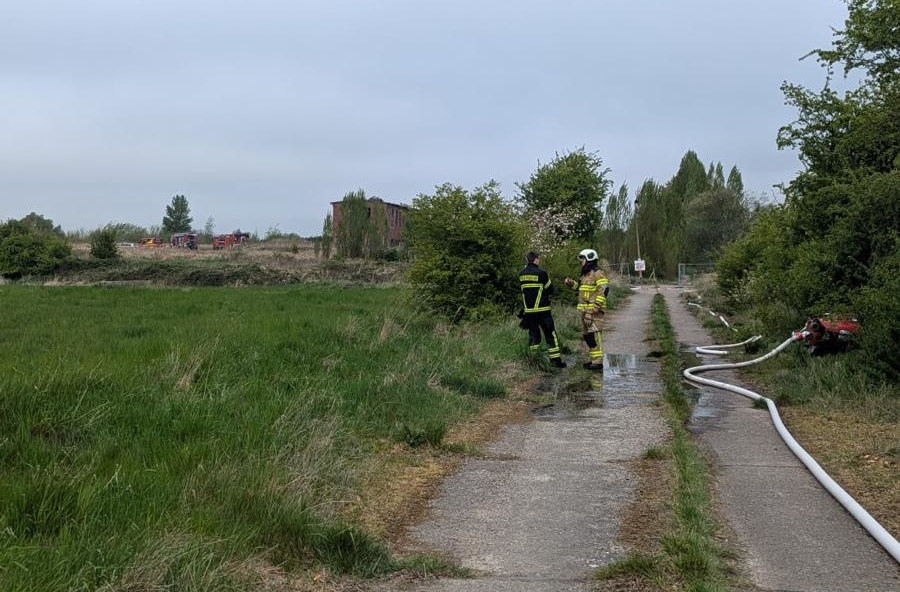 einem Hydranten über mehrere Fußwege zur Rückseite des Brandobjektes auf (ca. 250 m), um die dort eingesetzte FF Rövershagen mit Wasser zu versorgen. Danach wurde mit der TS eine Wasserentnahmestelle am Dorfteich eingerichtet und eine weitere Versorgungsleitung zur FF Poppendorf an der Vorderseite des Brandobjektes verlegt (ca. 350 m).