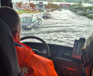 Durch Starkregen von bis zu 40 L/m2 in einer Stunde hervorgerufene Überflutungen; Wassereinbruch in zwei Stockwerken durch einen Rohrbruch in der Dachentwässerung in einem Möbelhaus.