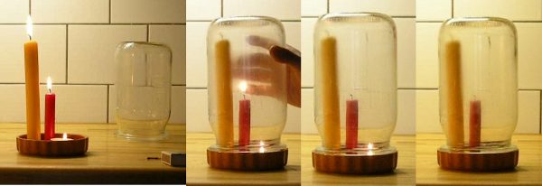 Sehen wir uns das mal wieder in einem Experiment an. Suche drei unterschiedlich lange Kerzen und bitte deinen Assistenten, sie anzuzünden. Dann stülpe ein Gefäß darüber (alle drei Kerzen müssen hineinpassen, probiere das im Zweifel vorher aus). Nun beobachte die Kerzen. Die längste erlischt zuerst, die kürzeste zuletzt.