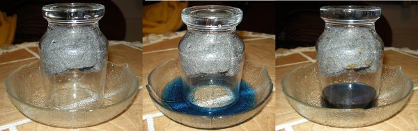 Wir suchen uns in der Werkstatt von Papa (oder Mama) feine Stahlwolle und feuchten die etwas an. Dann stopfen wir sie in ein Glas – es muss so viel Stahlwolle sein, dass sie im Glas oben hängen bleibt. Denn jetzt drehen wir das Glas um und stellen es in eine flache Schale. In die Schale gießen wir etwas Wasser, rund um das Glas herum. Nun brauchen wir etwas Geduld, auch wenn es schwer fällt, denn wir müssen warten. Und zwar mehrere Stunden. Seufz. Aber so ist das in der Wissenschaft. Man wartet ziemlich oft.