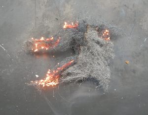 Probieren wir das doch einfach aus, schließlich sind wir Forscher. Wir pflücken die Stahlwolle etwas auseinander, legen sie in ein feuersicheres Gefäß und bitten unseren erwachsenen Assistenten, sie anzuzünden. Und siehe da – sie brennt. Nicht sehr doll, sie schmurgelt nur so ein bisschen, aber es ist immerhin aufregender als der langweilige Rostvorgang.