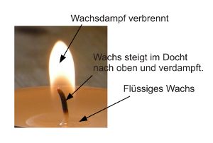 Zurück zu unserer Kerzenflamme. Wir müssen uns erst einmal darüber klar werden, was da eigentlich brennt. Wir wissen schon lange, dass eine Kerze kürzer wird, wenn sie brennt. Wenn aber die Kerze kürzer wird, verschwindet offenbar Wachs. Es ist also nicht der Docht, was da brennt, sondern das Wachs. (Ja, gut, der Docht verbrennt natürlich auch. Aber der entscheidende Brennstoff ist das Wachs.) Genau genommen ist es der Wachsdampf. Das Wachs wird durch die Hitze erst flüssig, steigt in den Docht auf, verdampft und der Dampf verbrennt dann.