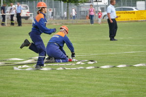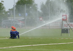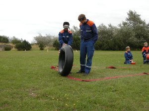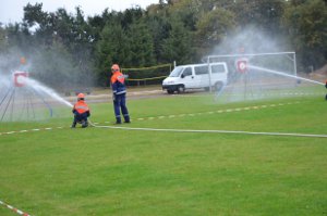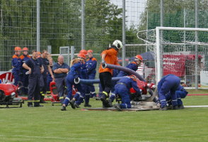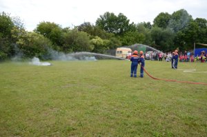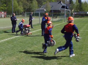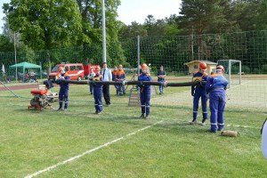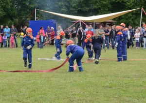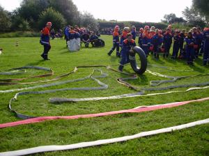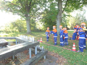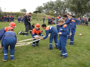 Es waren 16 Spielstationen vorbereitet, unter anderem: Feuerwehreinsatzsachen anziehen; Schlauch auf Zeit rollen; Pedalo fahren; Stiefelweitwurf; eine Leitung aus Regenrinnenteilen zu bauen, um darin Wasser zu fördern; bis hin zum Ertasten von Feuerwehrgeräten und einem Wissenstest!