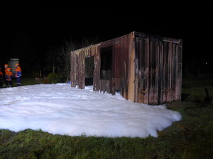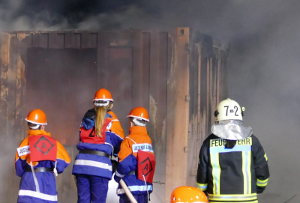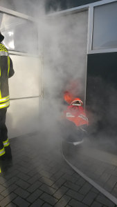 Am späten Nachmittag wurde es dann richtig aufregend – in Rövershagen brannte ein Container, genauer gesagt, Holz und Stroh im Innern des Containers. In Rövershagen ist natürlich erst einmal die dortige JFw zuständig, es wurden jedoch die JFw Bentwisch und Mönchhagen nachalarmiert (alle drei hatten zeitgleich ihr Blaulichtwochenende), sodass ein großer, gemeinsamer Einsatz stattfand. Bei so vielen Nachwuchs-Feuerwehrleuten war der Container denn auch bald gelöscht. Auch am Schaumrohr durften sich die Jfw-Mitglieder ausprobieren.