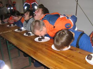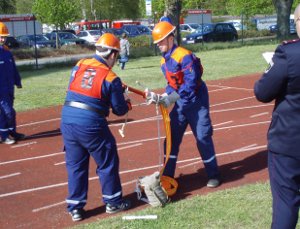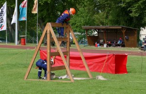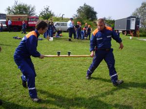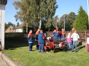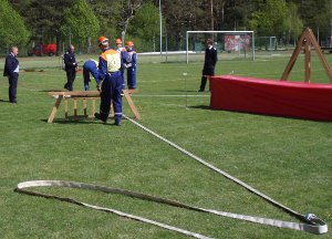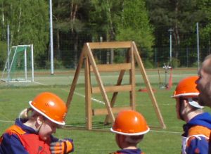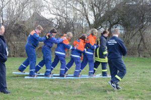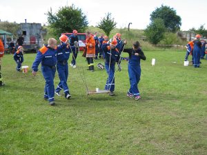 Trotz all der langen Geschichte und ehrwürdigen Tradition ging es bei der Jubiläumsfeier am 31. März natürlich nicht steif und trocken zu, sondern mit viel Spaß. (Trocken war es zum Glück dann doch – der befürchtete Regen blieb aus.) 6 Jugendwehren der Umgebung waren zu Gast und es galt, einen Spielparcours zu absolvieren. Dosen mussten mit Übungsfeuerlöschern umgeworfen werden; es musste geschätzt werden, wie viele Erbsen 500 g sind; superlange Nägel sollten in einen extra harten Balken geklopft werden; Feuerwehreinsatzsachen mussten auf Zeit angezogen und Einsatzstiefel möglichst weit geworfen werden; per Tastsinn war zu raten, welche Feuerwehrgeräte Alena in den Sack gesteckt hatte; ein Golfball musste durch einen Feuerwehrschlauch bugsiert werden (so ein Schlauch ist 20 m lang!) und eine besondere Herausforderung war das Paar Skier (zur Verfügung gestellt von der JFw Lambrechtshagen), mit dem 6 Wettkämpfer gleichzeitig laufen mussten.
