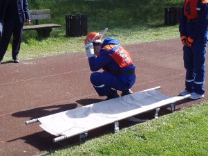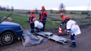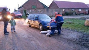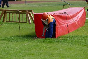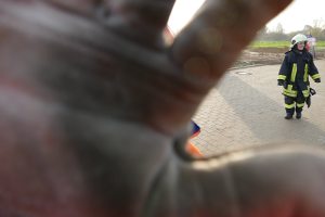 Nun konnte endlich geschlafen werden. Noch vor dem Frühstück am nächsten Morgen wurden wir um 7:30 Uhr eher unsanft aus unseren Feldbetten gerissen. Die Alarmierung lautete: Verkehrsunfall mit 2 verletzen Personen und auslaufender Flüssigkeit. Eine Person war angefahren worden, um diese kümmerte sich sofort der Rettungsdienst. Die Straße musste voll gesperrt werden. Der Fahrer stand unter Schock und wurde durch die Kameraden der Jugendfeuerwehr betreut. Zeitgleich kümmerten sich 2 weitere Einsatzkräfte um die auslaufende Flüssigkeit. Zuletzt wurde die Einsatzstelle an die Polizei übergeben, denn die Feuerwehr darf eine Straße zwar sperren, aber nicht wieder frei geben.