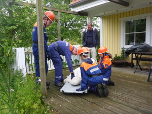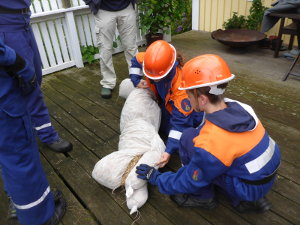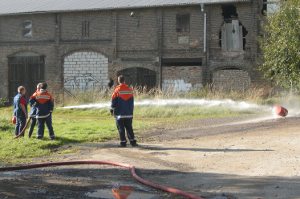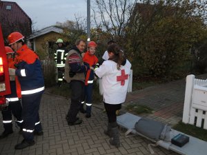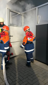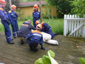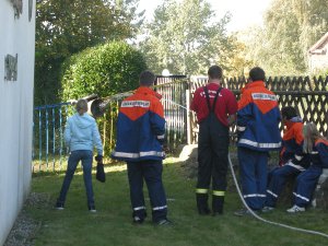 Beim Frühstück mit frischen Brötchen ließen wir alles nochmal Revue passieren – da heulte die Sirene schon wieder: Feuer in einer Garage, 3 Personen vermisst. Jetzt war wieder Schnelligkeit gefragt. Man sah vor lauter Rauch die Hand vor den Augen nicht mehr (auch wenn der Rauch nur ein Übungsnebel war). Aber da die Jugendfeuerwehr genau wusste, was zu tun ist, und das Vorgehen in verqualmten Gebäuden bereits geübt hatte, gelang es ihnen, alle 3 Personen schnell zu retten und das Feuer zu löschen.