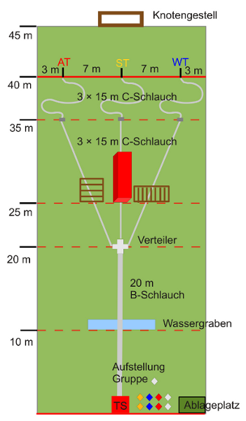 Es müssen drei Leitungen verlegt werden – eine Skizze des Spielfeldes finden Sie weiter unten. Die Gruppe stellt sich zwischen der Tragkraftspritze und dem Platz, wo sie die Geräte bereitgelegt hat, auf. Der Gruppenführer steht vor der Gruppe und gibt den Einsatzbefehl.