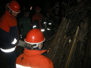 Konnten wir nun endlich zur Ruhe kommen? Wir machten es uns im Gemeindesaal bei einem Film so richtig gemütlich und genossen die Kinoatmosphäre. Müde und erschöpft gingen wir um 23:00 in unsere Feldbetten, die Nachtruhe war allerdings nicht von langer Dauer. Denn um 23:45 Uhr heulte wieder die Sirene. Einsatzstichwort war diesmal: 2 Personen in Not. Da der Einsatzort sehr dunkel und abgelegen war, musste die Jugendfeuerwehr erst mal den Lichtmast sowie weitere Scheinwerfer in Stellung bringen. Nachdem dies geschehen war, fanden sie 2 betrunkene Personen im Straßengraben, die es aus eigener Kraft nicht mehr herausschafften. Die Einsatzkräfte befreiten die beiden Trunkenbolde und klärten sie darüber auf, wie gefährlich Alkohol ist.