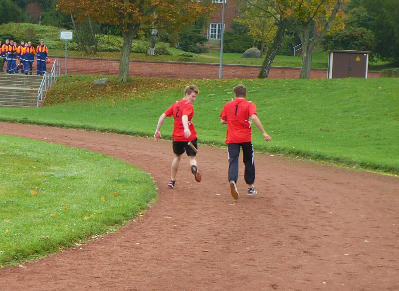 Der B-Teil besteht in einem 400-m-Staffellauf, bei dem die 9 Läufer unterschiedliche Aufgaben zu bewältigen haben. Die ersten beiden Läufer laufen jeder eine bestimmte Strecke ohne zusätzliche Aufgaben. Der 3. Spieler rollt auf seiner Strecke einen 15 m langen C-Schlauch auf, der 4. Spieler muss über einen Balken laufen. Der 5. Läufer liegt auf einer Trage, neben der seine Handschuhe, sein Helm und ein Koppel liegen. Sobald er an der Reihe ist, muss er sich anziehen und losrennen. Der 6. Läufer läuft wieder nur. Die folgenden beiden Spieler kuppeln ein C-Strahlrohr mit einem C-Schlauch zusammen und binden an dem Strahlrohr einen doppelten Ankerstich mit Halbschlag (das sind bestimmte Knoten). Der 9. und letzte Läufer muss einen Feuerwehrleinenbeutel werfen, bevor er durch das Ziel läuft.