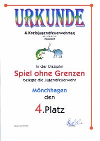 Die „Spiele ohne Grenzen“ sind Wettbewerbe, bei denen die Mannschaften mehrerer Jugendfeuerwehren gegeneinander antreten. Die teilnehmenden Mannschaften müssen verschiedene Geschicklichkeitsaufgaben lösen und neben sportlichem Ehrgeiz geht es hauptsächlich um Spaß. Am 4. September traten in der Kreisfeuerwehrzentrale in Kägsdorf 25 Mannschaften aus dem Landkreis Bad Doberan an und maßen sich in insgesamt 15 „Disziplinen“ wie Stiefelzielwurf, Ertasten von Geräten in einem Sack, Geräte zeichnen und anschließendes Erraten des Gezeichneten; einen Schlauch über einen Parcours rollen, so schnell wie möglich die Sachen der aktiven Feuerwehr anziehen oder Bechertransport mit Seilen. Mönchhagen wurde von 10 Kindern aus der Jugendfeuerwehr und 2 Betreuern vertreten.