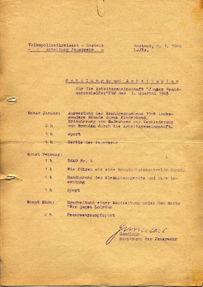 Die Themen der Übungen wurden in Schulungs- und Ausbildungsplänen vom Volkspolizeikreisamt Rostock, Abteilung Feuerwehr vorgegeben. So etwa für das 1. und 2. Quartal im Jahr 1965: Sport stand in jedem Monat auf dem Ausbildungsplan. Im Januar sollte das Brandgeschehen 1964 ausgewertet werden, vor allem Brände durch Kinderhand, Maßnahmen zur Verhinderung von Bränden sollten dabei erläutert werden. Außerdem widmete sich eine Stunde den Geräten der Feuerwehr. Im Februar waren die Themen „Wie führen wir eine Brandschutzkontrolle durch?“ und „Handhabung der Kleinlöschgeräte und ihre Anwendung“. Im März gab es zwei Stunden Feuerwehrkampfsport, im April gab es zwei Stunden „Geräte der Feuerwehr“, im Mai ging es um die Handhabung der Kleinlöschgeräte und im Juni sollte eine Wandzeitung unter dem Motto „Wir jagen den Lodrian“ gestaltet werden.