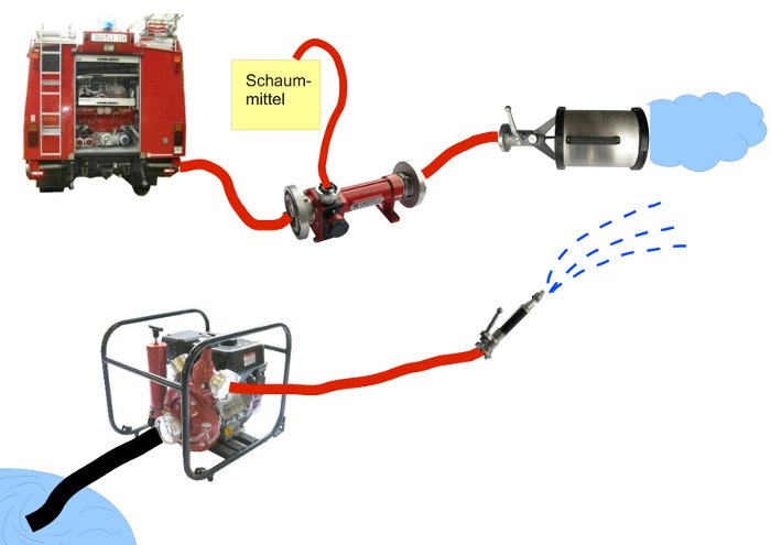 In der Grafik sehen Sie die Skizze eines Einsatzes. Fahren Sie mit der Maus über die Grafik und suchen Sie die eingesetzten Pumpen. Berührt Ihr Mauszeiger ein Gerät, das eine Pumpe darstellt oder in sich birgt, wird Ihnen als Tooltip die Bezeichnung des jeweiligen feuerwehrtechnischen Gerätes angezeigt. Wenn Sie das Gerät anklicken, erscheint unter der Grafik ein Text, der Ihnen verrät, welche Pumpenart sich darin verbirgt. Fünf Pumpen in drei verschiedenen Arten müssen Sie finden … (Tipp: Eine Pumpe ist Teil einer anderen Pumpe.)