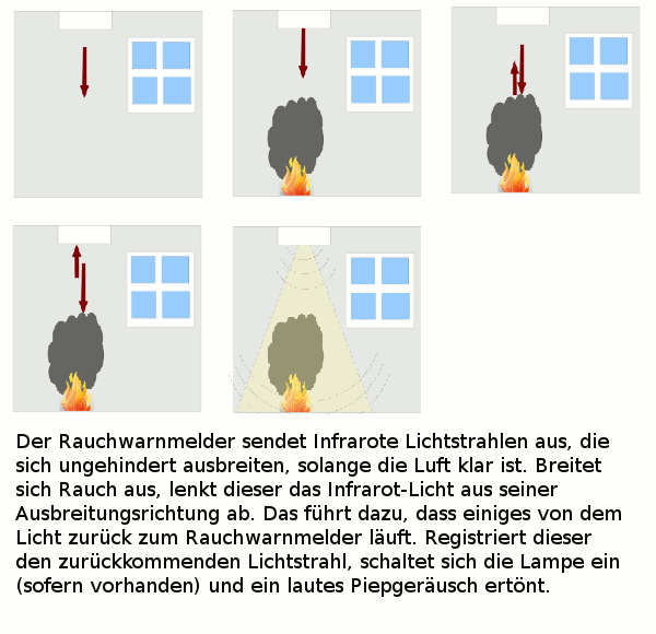 Ein Rauchwarnmelder ist ein Brandmelder, also ein Gerät, das bei einem Brand einen Alarm auslöst. Ein Rauchwarnmelder tut dies automatisch, soll heißen, er erkennt den Rauch und beginnt, ohrenbetäubend zu piepen. Die z.Zt. häufigste Variante sendet einen Lichtstrahl aus (Infrarot). Solange die Luft im Raum klar ist, breitet sich der Strahl ungehindert aus und es passiert nichts. Befinden sich aber Rauchpartikel in der Raumluft, streuen diese das Licht, was bedeutet, der Lichtstrahl wird abgelenkt. Dabei trifft dann auch ein Teil wieder auf den Rauchmelder und wird dort von einem Sensor registriert. Daraufhin gibt der Rauchmelder Alarm in Form eines akustischen Signals. Seine Aufgabe ist also nicht, die Feuerwehr zu alarmieren, sondern die Bewohner aufmerksam zu machen und gegebenenfalls zu wecken, da besonders schlafende Menschen Gefahr laufen, einen Brand nicht rechtzeitig zu bemerken.